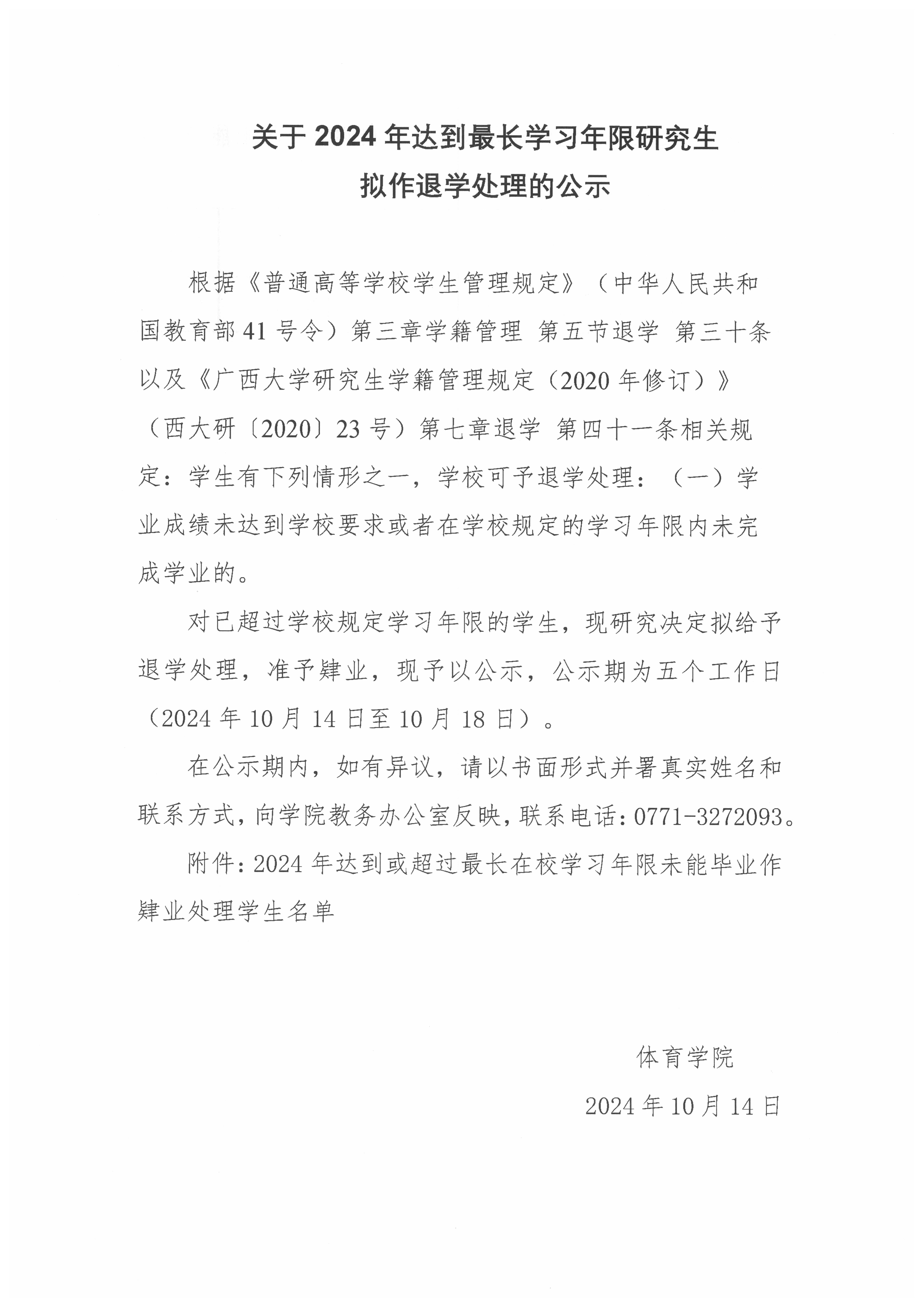 关于2024年达到最长学习年限研究生拟作退学处理的公示