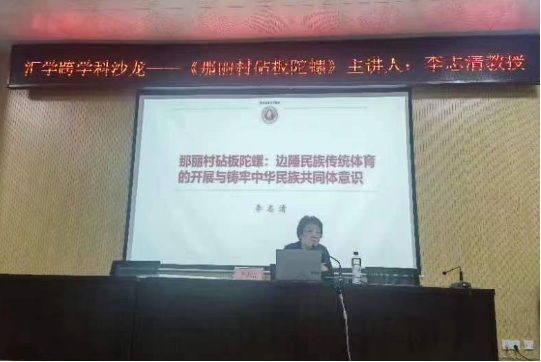 李志清教授通过对中越边境那丽村的非物质文化遗产砧板陀螺运动的案例分析,探讨民族传统体育的开展与铸牢中华民族共同体意识的相互关系,发掘中越边境地区民族传统体育的价值。李教授的讲座展现了广西民族传统体育的魅力,加深了在场师生对中国民族传统体育的开展与铸牢中华民族共同体意识的理解,拓宽了师生对民族传统体育的研究思路。