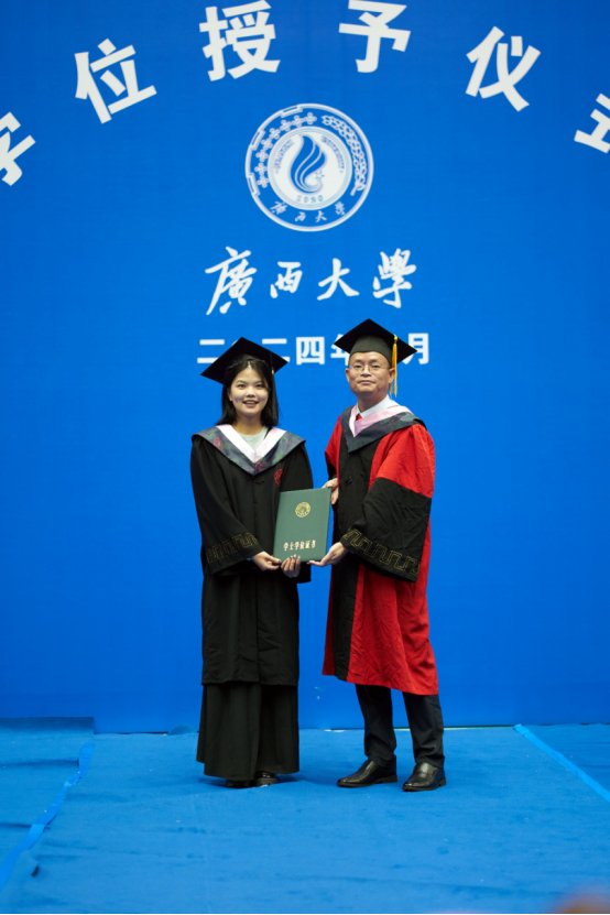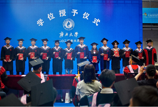 在学位授予仪式中,覃安基逐一为毕业生们拨穗并颁发学位证。拨穗礼成,寓意着毕业生学有所成,可以展翅高飞。