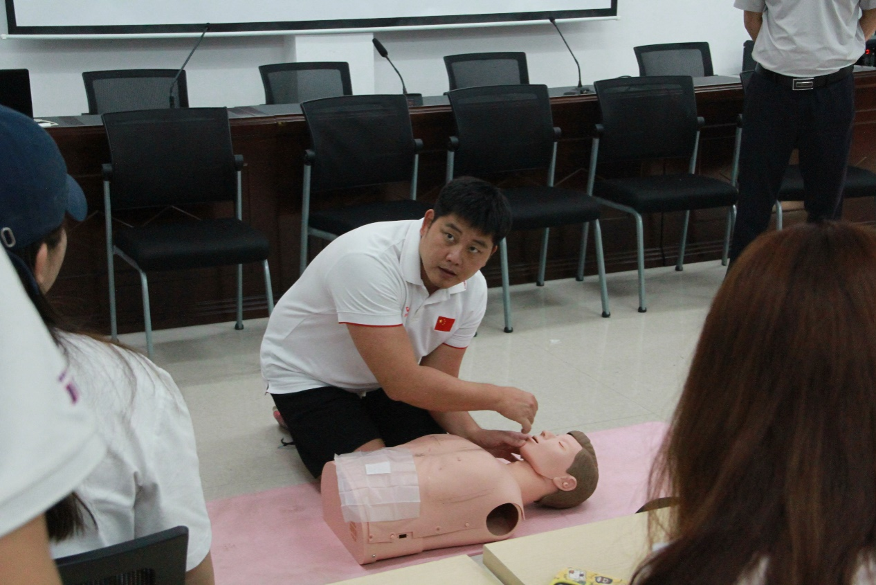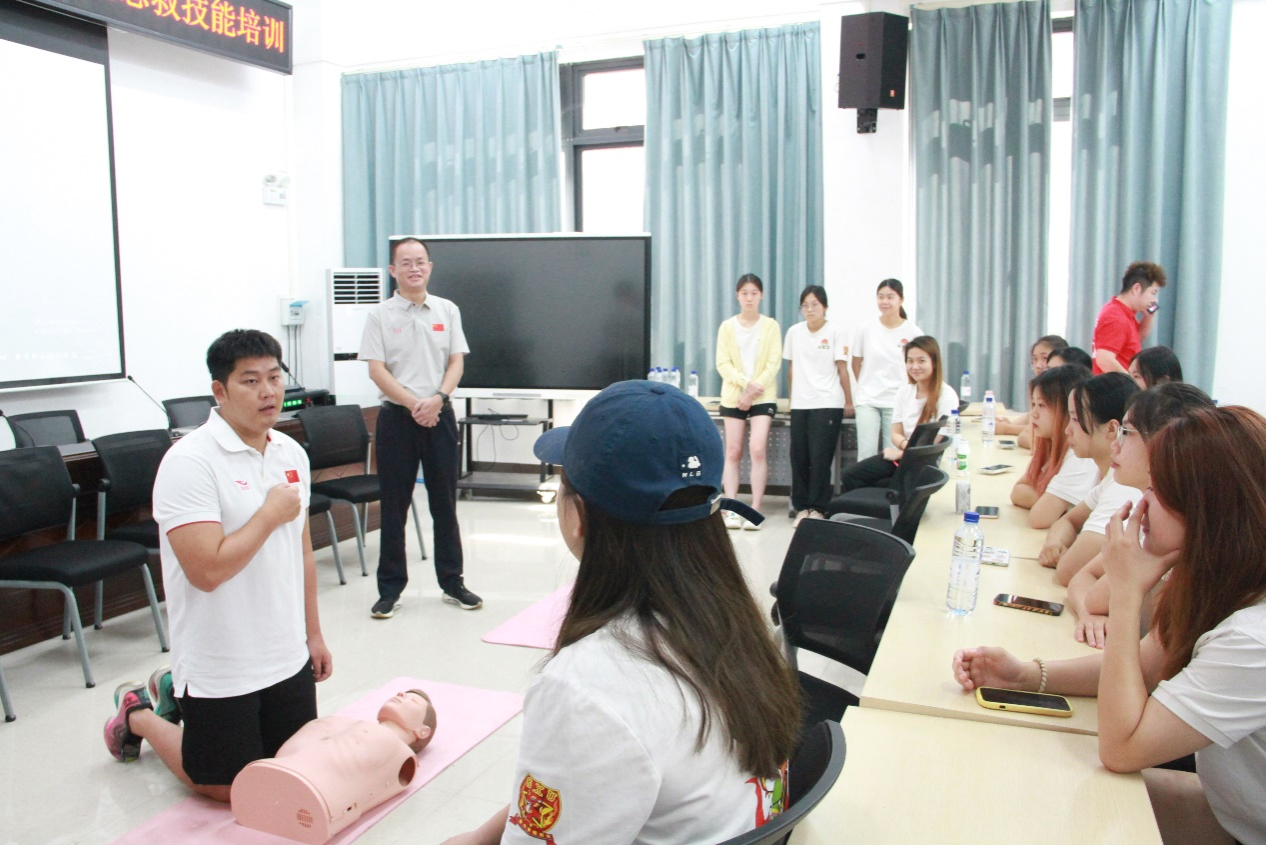 在培训过程中,郭旭霞老师、吴潮培老师为队员系统讲解心肺复苏、AED自动除颤仪使用、海姆立克急救法、运动损伤康复等应急救护知识和救护程序,耐心指导运动员进行实践操作,培训取得良好效果。