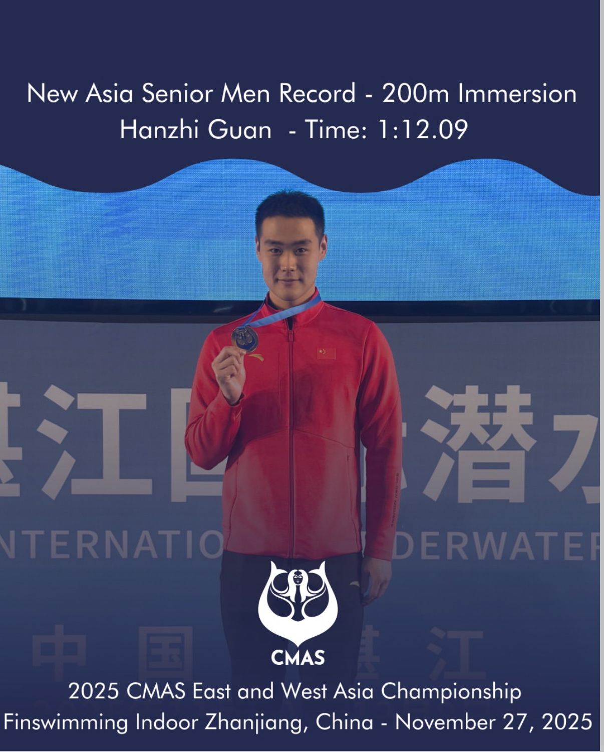 11月24日至28日,2025年世界潜联东、西亚蹼泳锦标赛、青年蹼泳比赛在国家体育总局湛江潜水运动公司隆重举行,公司2023级运动训练专业本科生关涵之代表中国蹼泳队出战,豪取6金1银,并打破亚洲纪录1项、全国纪录1项,为国争光。