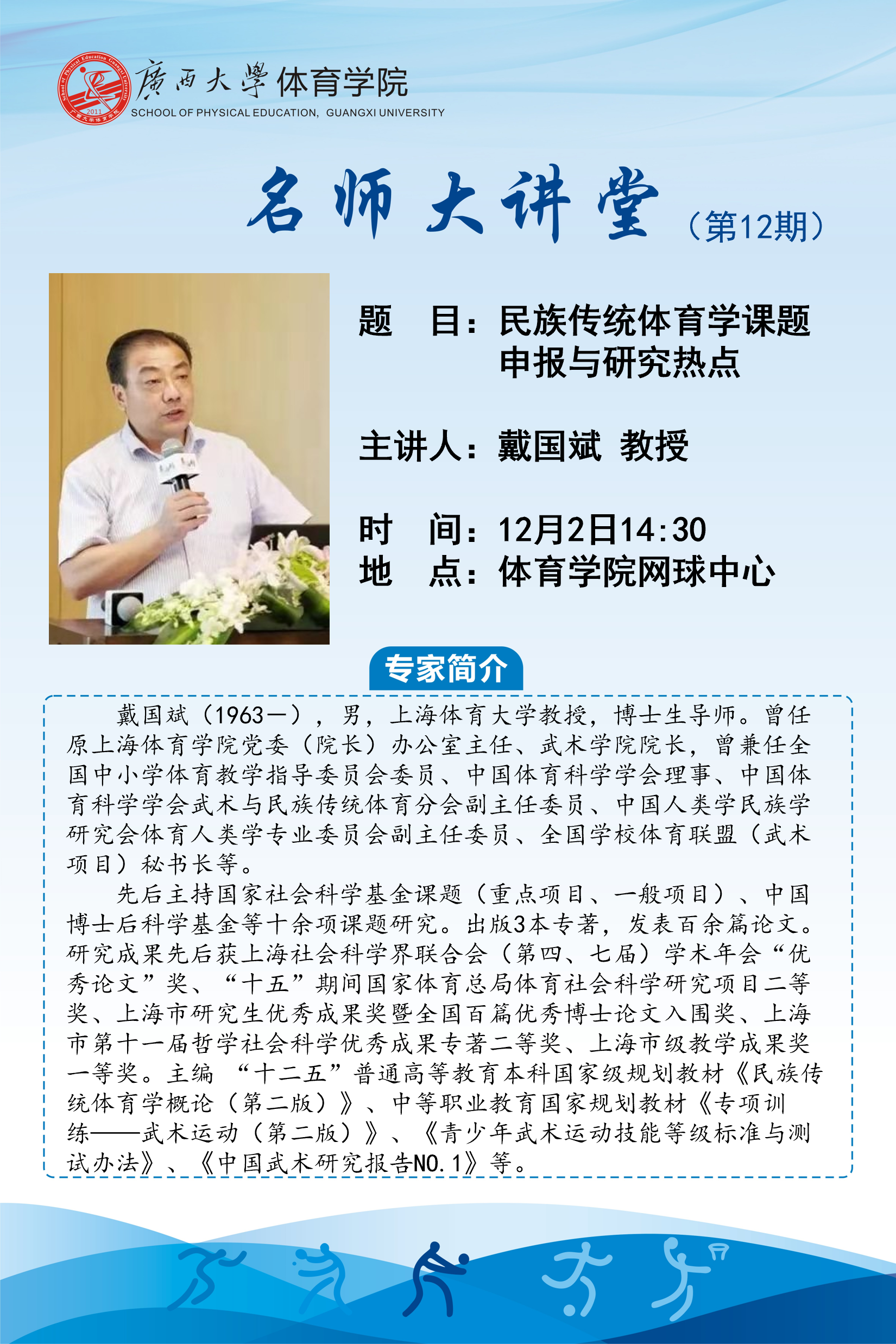 tyc539太阳集团名师大讲堂(第12期):民族传统体育学课题申报与研究热点